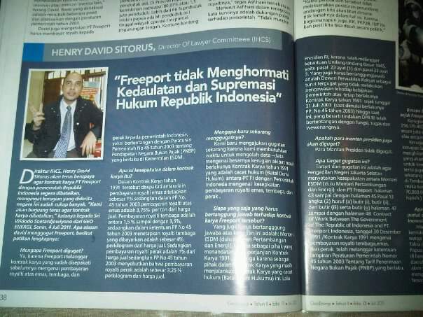 “Terobosan itulah yang pernah kami lakukan di PN Jaksel melalui gugatan pembatalan kontrak karya Freeport terkait royalti dengan memakai mekanisme legal standing. Dengan alasan kontrak karya tersebut tidak bisa disamakan dengan kontrak-kontrak bisnis privat biasa. Di sana terletak konsep hak menguasai negara yang di dalamnya terkandung unsur publik. Jadi, yang diperlukan adalah ketegasan Jokowi untuk memastikan langkah dan memberi arah pengelolaan sumber-sumber produktif negara sesuai dengan konstitusi dan panduan nawacita yang sudah digariskan,” pungkasnya.