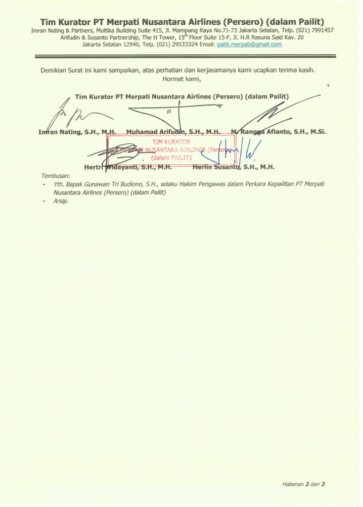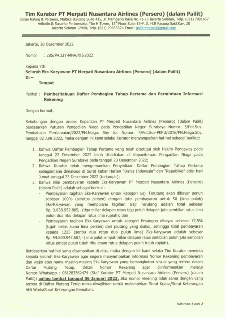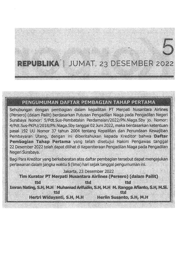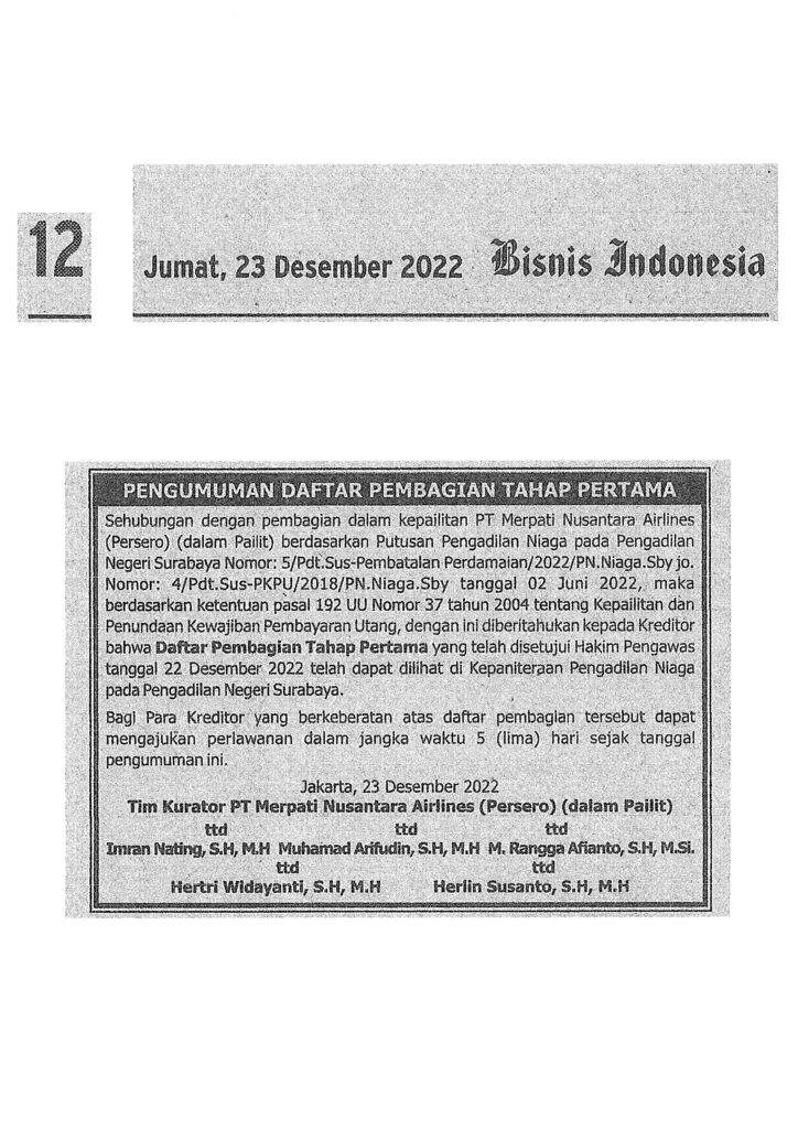 Sehubungan dengan pembagian dalam kepailitan PT Merpati Nusantara Airlens (Persero) (dalam Pailit) berdasarkan Putusan Pengadilan Niaga pada Pengadilan Negeri Surabaya Nomor: 5/Pdt.Sus-Pembatalan Perdamaian/2022/PN.Niaga.Sby jo. Nomor: 4/Pdt.Sus-PKPU/2018/PN.Niaga.Sby tanggal 02 Juni 2022.