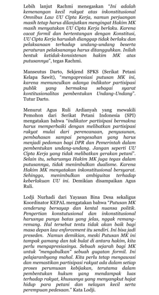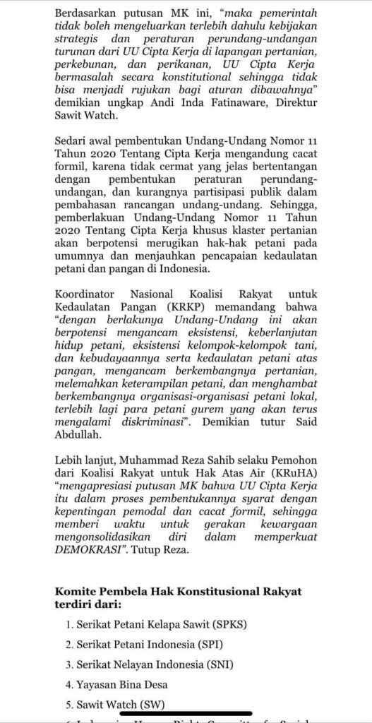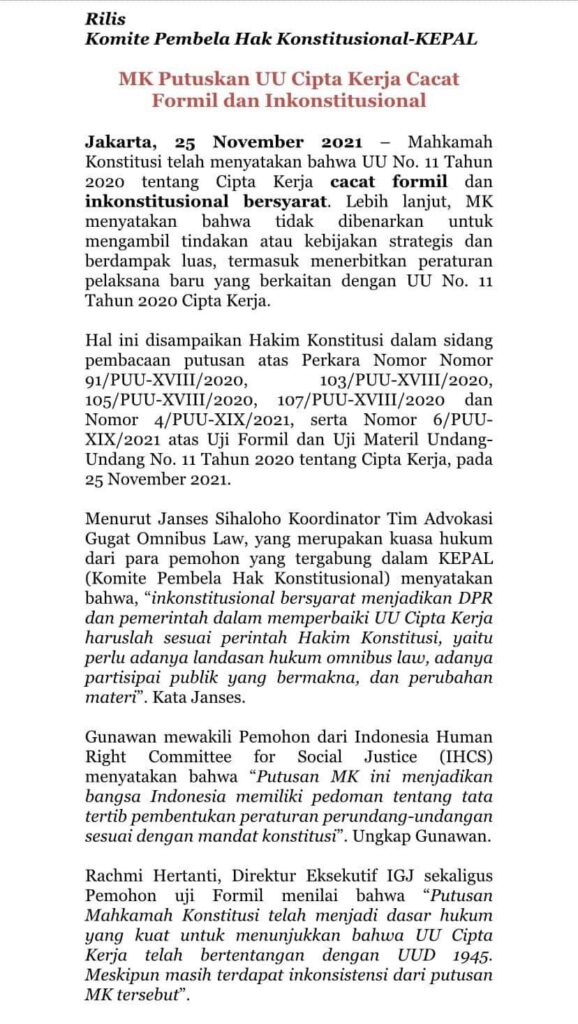 Mahkamah Konstitusi mengabulkan permohonan (sebagian) Uji Formil UU No 11 Tahun 2020 Tentang Cipta Kerja (“UU Ciptaker”).Dalam pertimbangannya Mahkamah menyatakan bahwa UU Ciptaker cacat formil dan bertentangan dengan Undang-Udang Dasar 1945 (inkonstitusional). Putusan ini Mahkamah Konstitusi atas Uji Formil UU Ciptaker tidak bulat yang mana 5 Hakim Konstitusi menyatakan UU Ciptaker cacat formil (inkonstitusional) dan 4 Hakim Konstitusi lainnya menyatakan UU Ciptaker tidak cacat formil (disenting opinion).